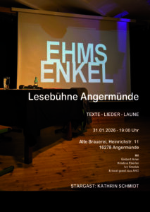 Lesebühne 30. Januar 2026Nina Tietze Lesebühne von Braue 3 3 people viewed this event. Für Veranstaltung registrieren Um dich für diese Veranstaltung zu registrieren, besuche den folgenden Link: → Datum und Uhrzeit 2026-01-31 @ 19:00 bis 2026-01-31 @ 23:00 Ort Jugendkulturzentrum Alte Brauerei Veranstaltungsarten Lesung Veranstaltungskategorie Sonstige Veranstaltungen Share With Friends Facebook Twitter LinkedIn Xing Pinterest
